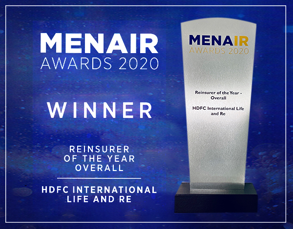 HDFC International Life and Re (HDFC International Life and Re) wins the 'Reinsurer of the year - Overall' at the MENAIR AWARDS 2020 held in Dubai on 28 January 2020. Winners were chosen from over 200 applicants across the Middle East and North Africa region. The awards were presented in recognition of groundbreaking achievements by insurers, reinsurers and brokers in these markets.
